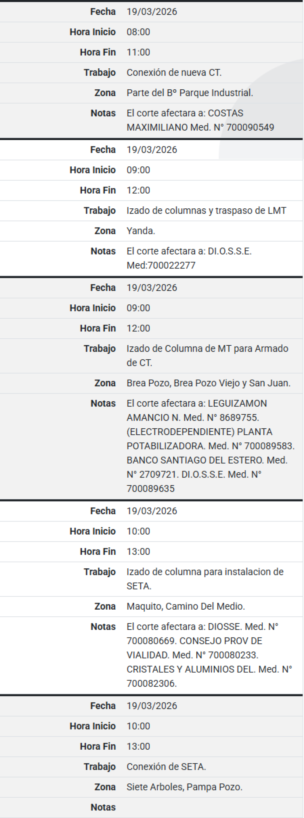 Este jueves 19 de marzo se realizarán cortes programados de energía eléctrica en Santiago del Estero. La medida forma parte de tareas de mantenimiento y trabajos técnicos que la empresa distribuidora ejecutará para mejorar el servicio en distintos sectores de la provincia.