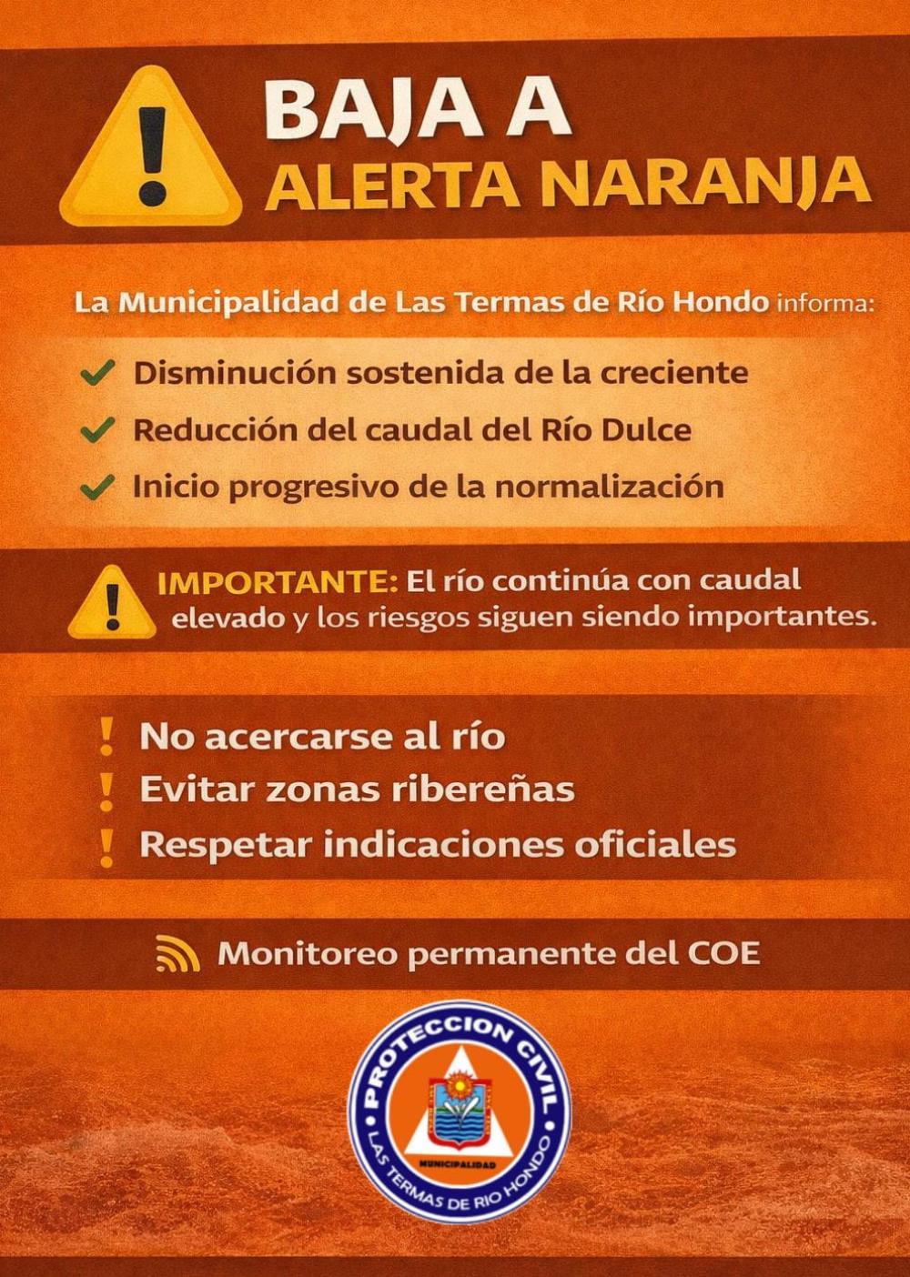 El Comité de Emergencia Municipal (COE) de Las Termas de Río Hondo informó que el nivel de alerta del río Dulce descendió de rojo a naranja, en función de una leve mejora en las condiciones hidrológicas registradas en las últimas horas. La medida responde a una disminución progresiva del caudal, aunque las autoridades aclararon que la situación aún requiere precaución.