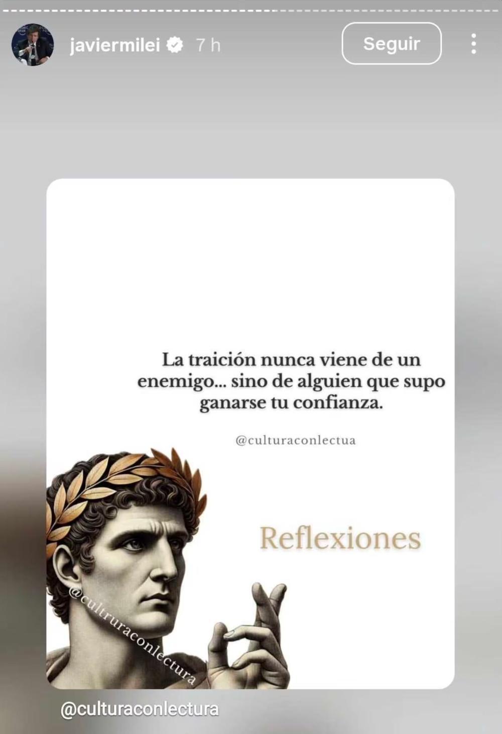 "La traición nunca viene de un enemigo, sino de alguien que supo ganarse tu confianza", fue el texto que replicó desde una cuenta dedicada a contenidos culturales, acompañado por una imagen de Julio César.