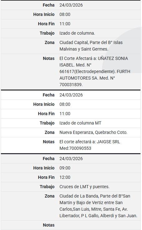 Cortes programados de electricidad para este 24 de marzo en Santiago del Estero: a qué hora y en qué barrios Cortes programados de electricidad para este 24 de marzo en Santiago del Estero: a qué hora y en qué barrios