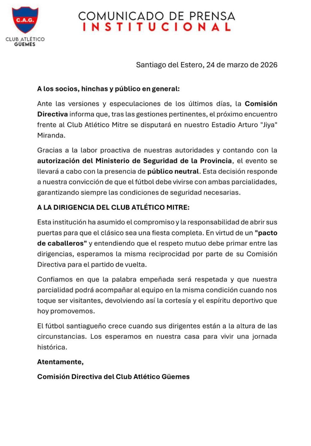En el mismo texto, la dirigencia hizo referencia a un "pacto de caballeros" con Club Atlético Mitre, expresando su expectativa de que en el partido de vuelta se permita también la presencia de hinchas de Güemes en condición de visitantes.