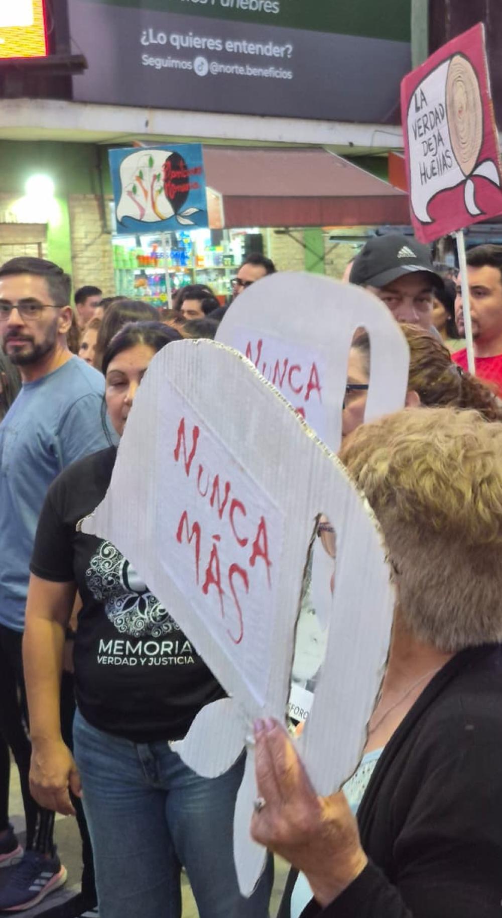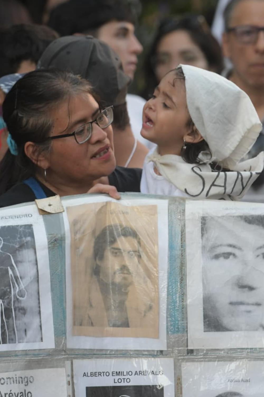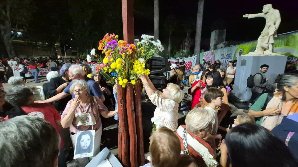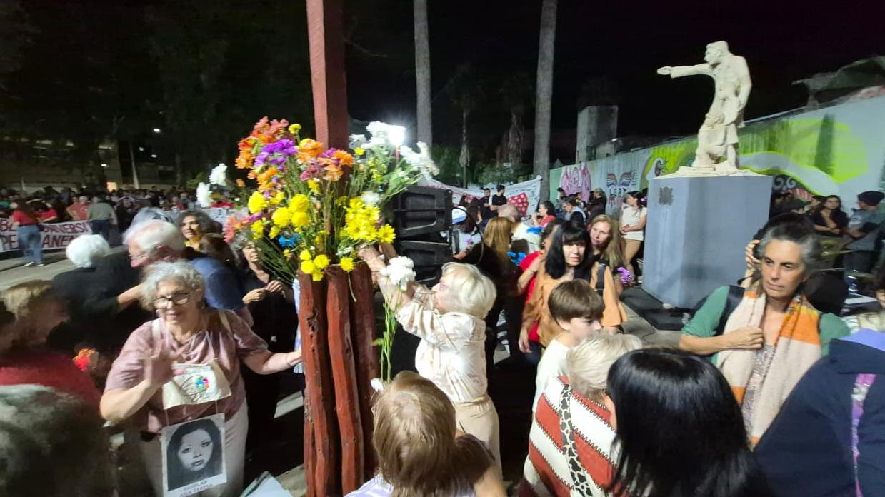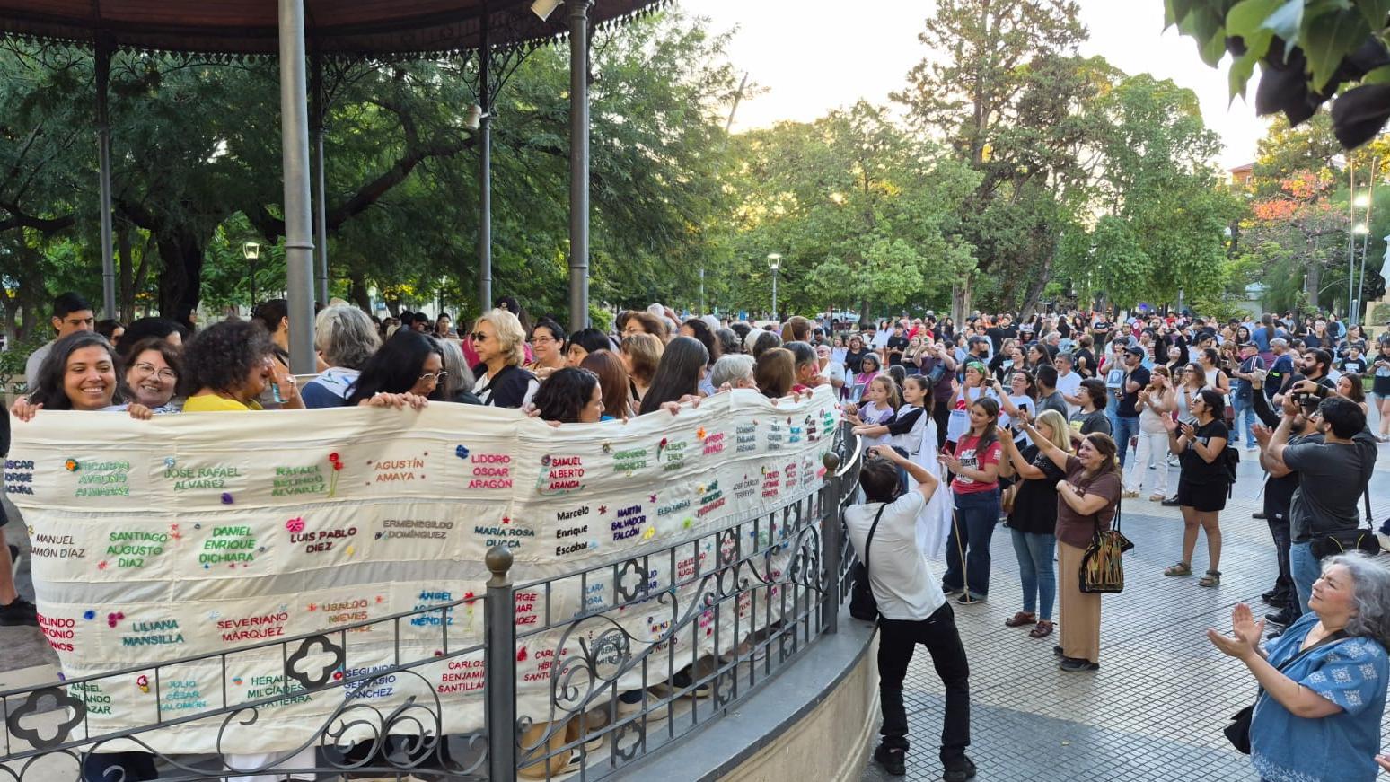 La plaza se llena de pañuelos blancos, fotos de rostros jóvenes y carteles que gritan consignas de lucha. La emoción se palpita en el aire, mientras la historia y la lucha se entrelazan en un abrazo de resistencia. Los presentes, de todas las edades, se unen en un clamor por los que ya no están, por la verdad que aún se busca y por la justicia que sigue pendiente.