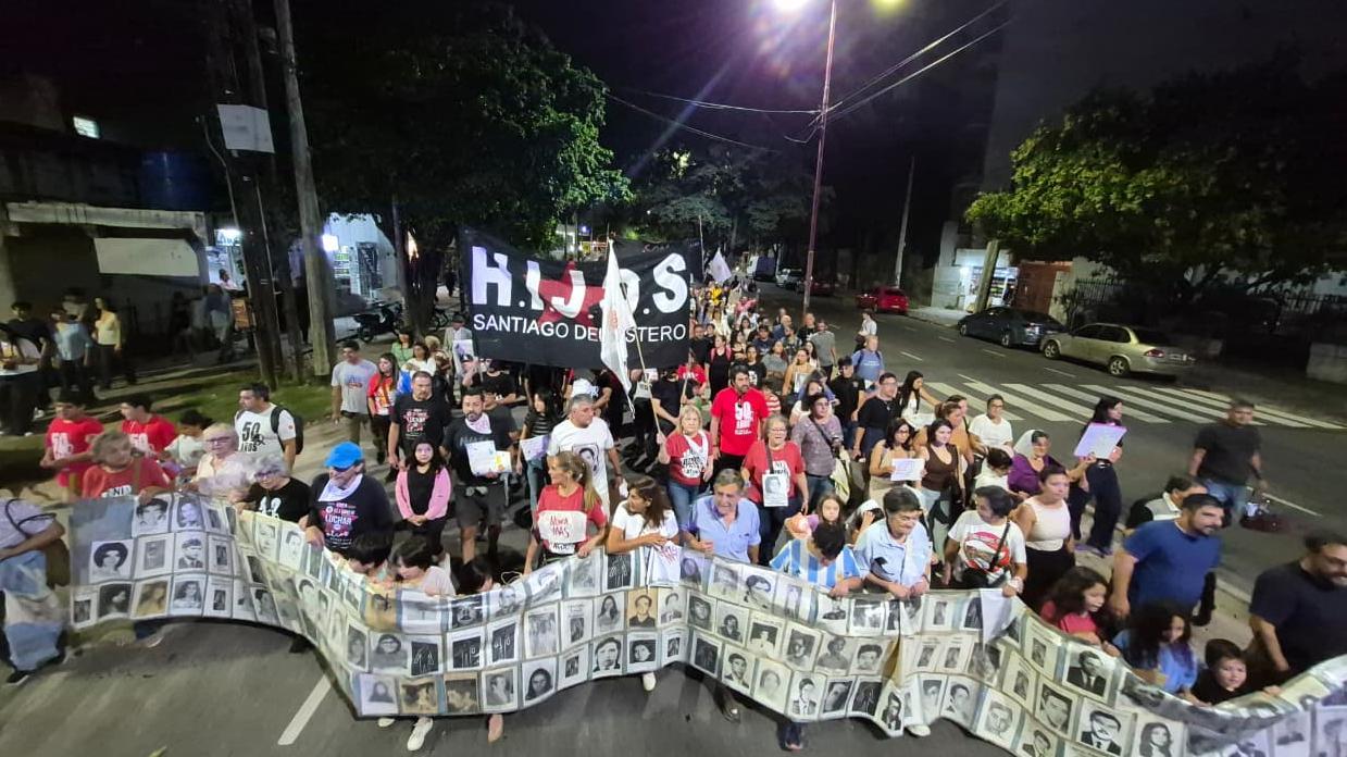 Suena "Marcha de la bronca" , la bandera de los desaparecidos santiagueños se despliega, como un recordatorio de lo que se lucha y se recuerda. H.I.J.O.S. se hace presente, con sus voces y sus historias, manteniendo viva la llama de la memoria. La Plaza Libertad es hoy un espacio de encuentro, de reflexión y de compromiso.