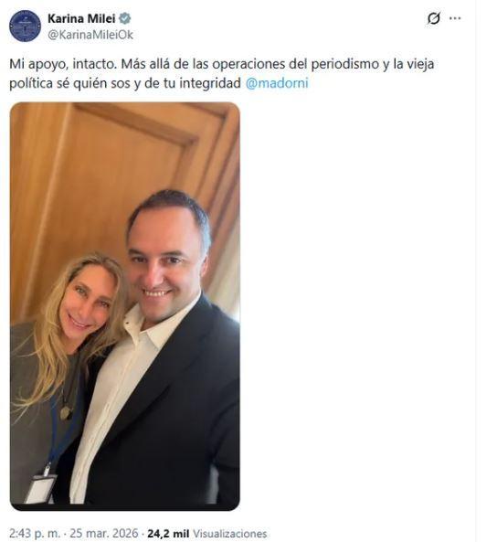 En ese contexto, Karina Milei utilizó su cuenta oficial en la red social X (ex Twitter) para manifestar su apoyo de manera contundente. "Mi apoyo, intacto", escribió al inicio de su mensaje, y luego apuntó contra los sectores críticos: "Más allá de las operaciones del periodismo y la vieja política sé quién sos y de tu integridad @madorni".