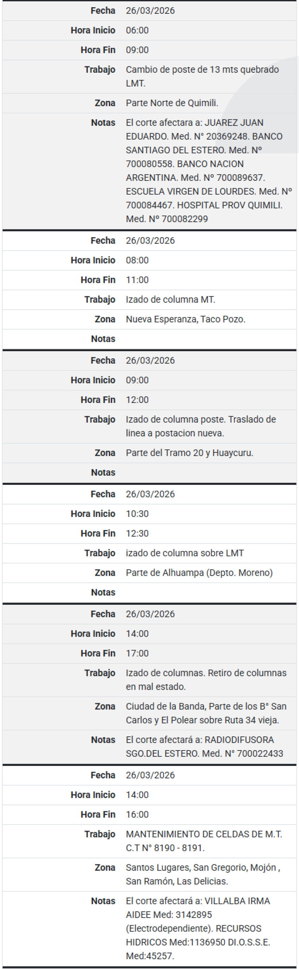 Este jueves 26 de marzo se realizarán cortes programados de energía eléctrica en Santiago del Estero. La medida forma parte de tareas de mantenimiento y trabajos técnicos que la empresa distribuidora ejecutará para mejorar el servicio en distintos sectores de la provincia.