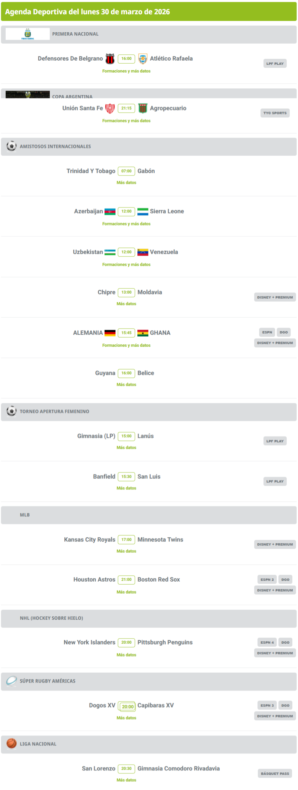 Agenda deportiva: hora y dónde ver los partidos de este 30 de marzo Agenda deportiva: hora y dónde ver los partidos de este 30 de marzo