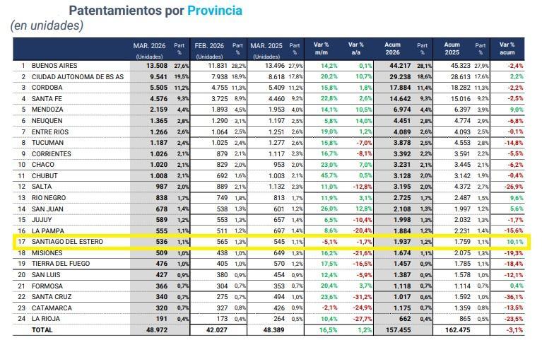 De acuerdo con el informe de patentamientos por provincia de ACARA, en marzo se registraron 536 unidades en el distrito santiagueño.