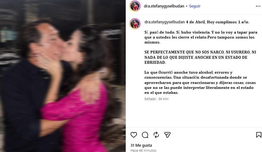 A través de un posteo en Instagram, la mujer expresó: "Hoy cumplimos un año. Sí, pasó de todo. Sí, hubo violencia. Y no lo voy a tapar para que a ustedes les cierre el relato. Pero tampoco somos los mismos". En ese mismo mensaje, también salió al cruce de versiones que circularon, negando categóricamente acusaciones: "Sé perfectamente que no sos narco, ni usurero, ni nada de lo que dijiste anoche en un estado de ebriedad".