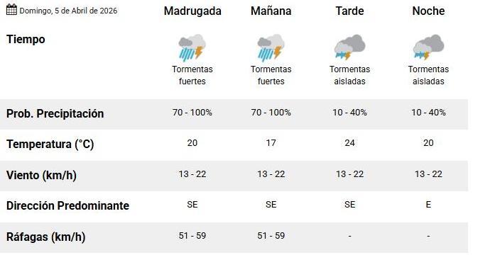 Durante la madrugada y la mañana se esperan tormentas fuertes, con una probabilidad de precipitaciones que se ubicará entre el 70% y el 100%, lo que configura un inicio de jornada pasado por agua y con posibles fenómenos intensos.