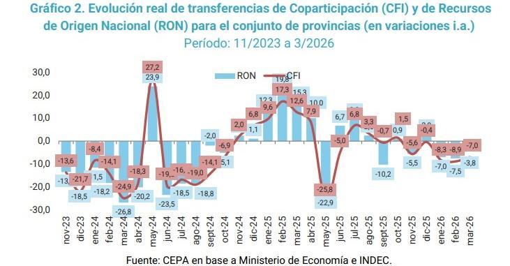 El documento detalló que "en el mismo sentido, la Coparticipación Federal de Impuestos exhibió una caída de 7% i.a (interanual)., que ya había sufrido una caída en enero y febrero de 2026 de 8,3% y 8,9% respectivamente. En promedio, el trimestre fue muy magro: -6,1% en RON y -8,0% en Coparticipación".