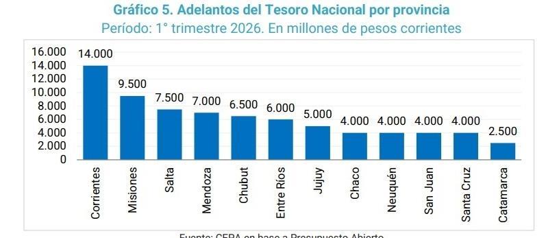 En materia de transferencias no automáticas Adelantos del Tesoro Nacional (ATN) no todas las provincias fueron favorecidas con esos envíos. "En el acumulado del primer trimestre de 2026, -detalló- Corrientes fue la que concentró el mayor volumen, con más de $14.000 millones, Misiones ($9.500 millones), Salta ($7.500 millones), Mendoza ($7.000 millones), Chubut ($6.500 millones), Entre Ríos ($6.000 millones), Chaco ($4.000 millones), Neuquén ($4.000 millones), Jujuy ($4.000 millones), San Juan ($4.000 millones) Santa Cruz ($4.000 millones) y Catamarca ($2.500 millones)". A su vez, "en 2025, en ninguna provincia los ATN representaron más del 2% del total de sus recursos".