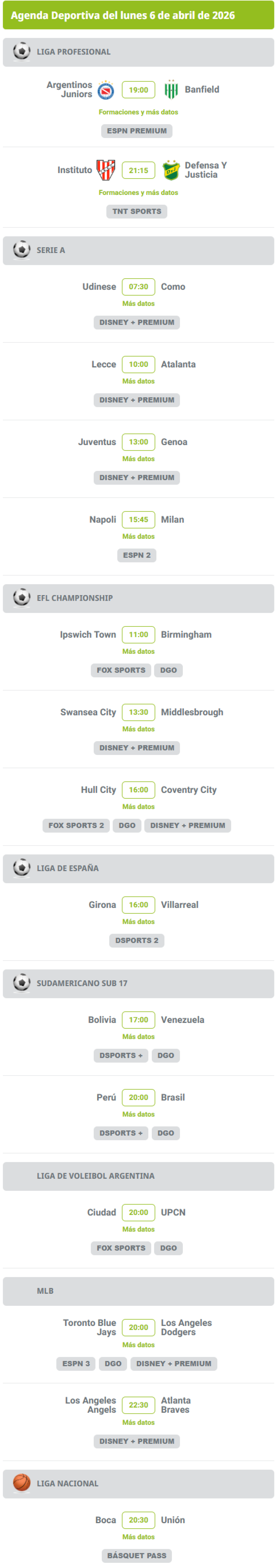 Agenda deportiva: hora y dónde ver los partidos de este 6 de abril Agenda deportiva: hora y dónde ver los partidos de este 6 de abril