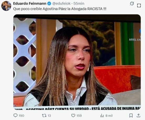 Mientras que sobre su testimonio, el periodista manifestó: "Qué poco creíble Agostina Páez, la abogada racista".