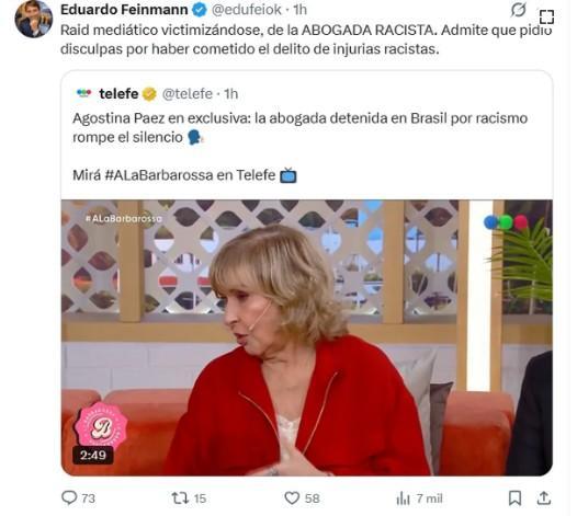 Luego de permanecer más de dos meses detenida en Brasil bajo la acusación de injuria racial, la abogada argentina Agostina Páez regresó al país y comenzó un recorrido por diversos medios de comunicación. Sin embargo, su aparición en la esfera pública no fue bien recibida por todos; el periodista Eduardo Feinmann fue uno de los críticos más feroces, calificándola de "vergüenza para toda la Argentina" .