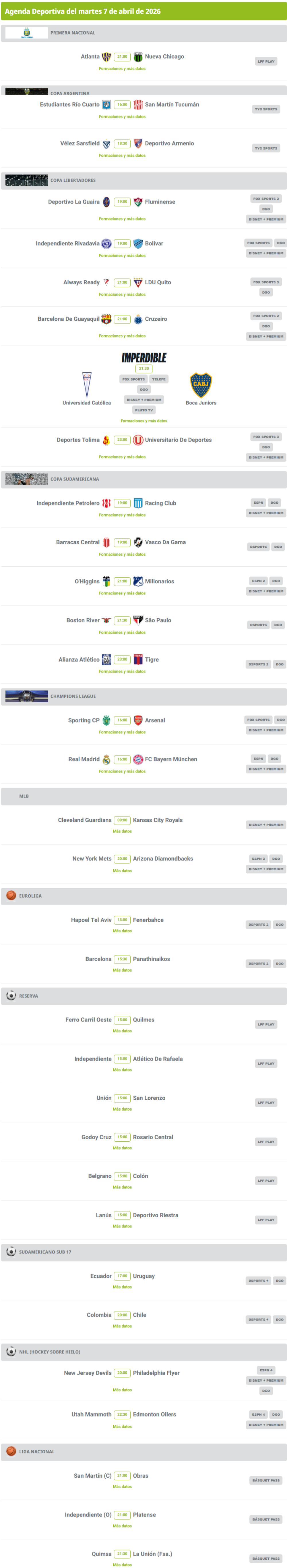 Agenda deportiva: hora y dónde ver los partidos de este 7 de abril Agenda deportiva: hora y dónde ver los partidos de este 7 de abril