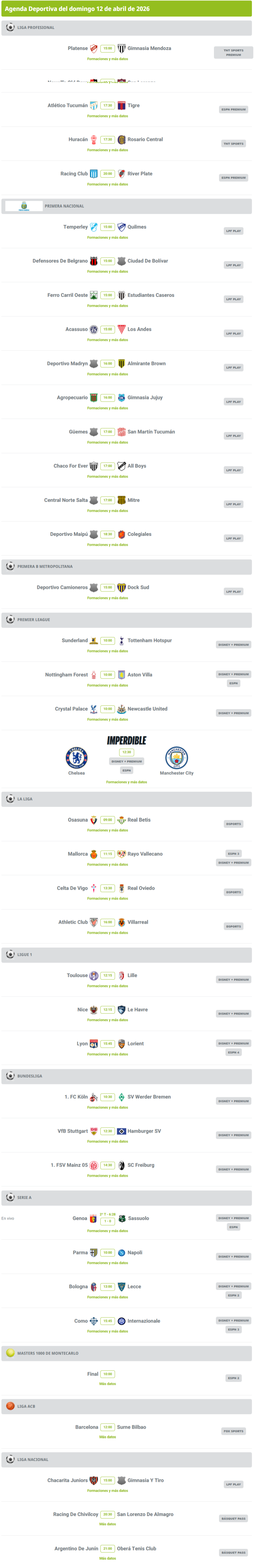 Agenda deportiva: hora y dónde ver los partidos de este 12 de abril Agenda deportiva: hora y dónde ver los partidos de este 12 de abril