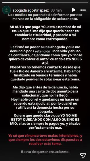 Páez afirmó que su ex firmó un poder a una abogada, quien avanzó con una denuncia por "retención indebida y abuso de confianza", lo que según indicó distorsiona la situación. "Me denunció dejándome como que yo 'No le quiero devolver el auto' cuando esto NO ES ASÍ", expresó.