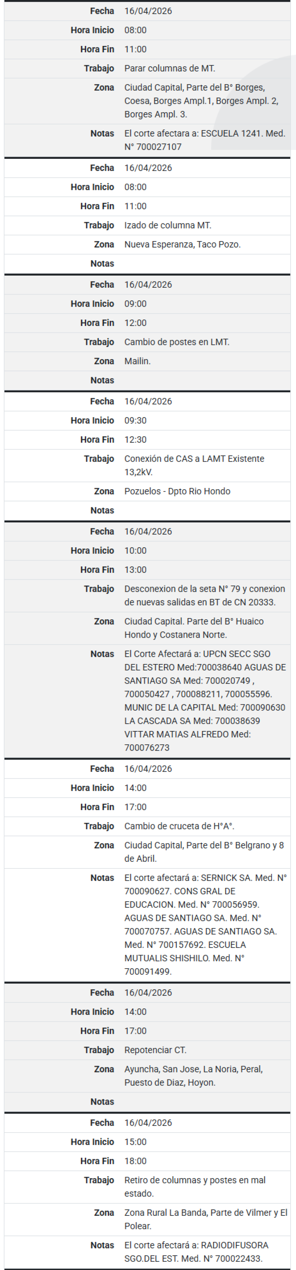 Cortes programados de electricidad para este 16 de abril en Santiago del Estero: a qué hora y en qué barrios Cortes programados de electricidad para este 16 de abril en Santiago del Estero: a qué hora y en qué barrios