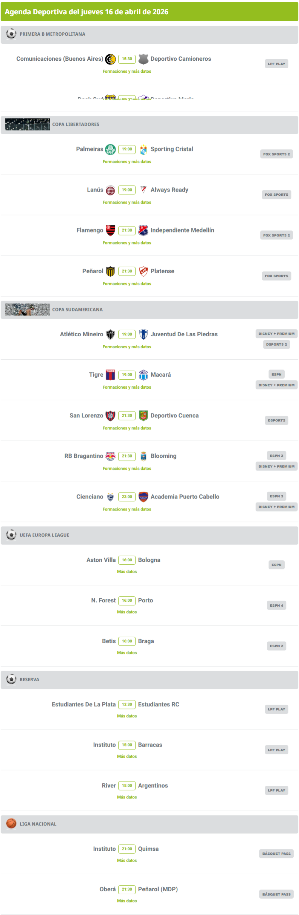 Agenda deportiva: hora y dónde ver los partidos de este 16 de abril Agenda deportiva: hora y dónde ver los partidos de este 16 de abril