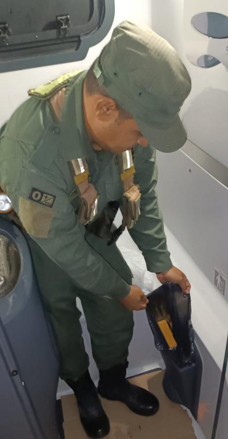 Tras el registro del rodado, los gendarmes encontraron en el tacho de basura del baño dos paquetes que contenían 2 kilos 144 gramos de cocaína, los cuales no lograron identificar a los propietarios del estupefaciente.
