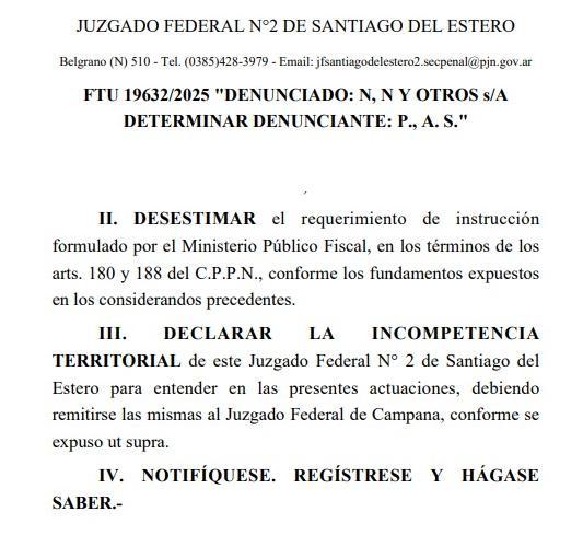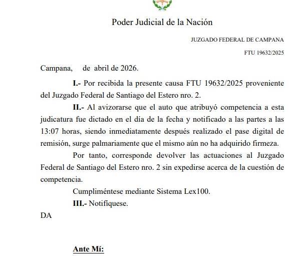 La decisión se adoptó en el expediente N° 19632/2025, que había sido remitido desde Santiago del Estero luego de que ese juzgado se declarara incompetente. Sin embargo, el tribunal con asiento en Campana resolvió no expedirse sobre la cuestión de competencia en esta instancia, al entender que no se cumplieron los plazos procesales de tres días, para que las partes puedan apelar la decisión de un magistrado federal.