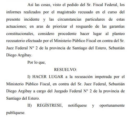 Como la Cámara Federal de Apelaciones apartó al juez Argibay, tiene que sortear un nuevo magistrado para la causa y que tiene que salir de Santiago del Estero, Tucumán o Catamarca.