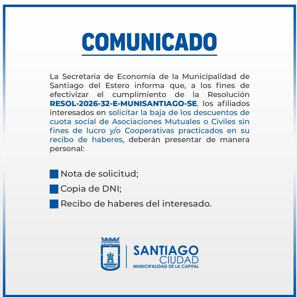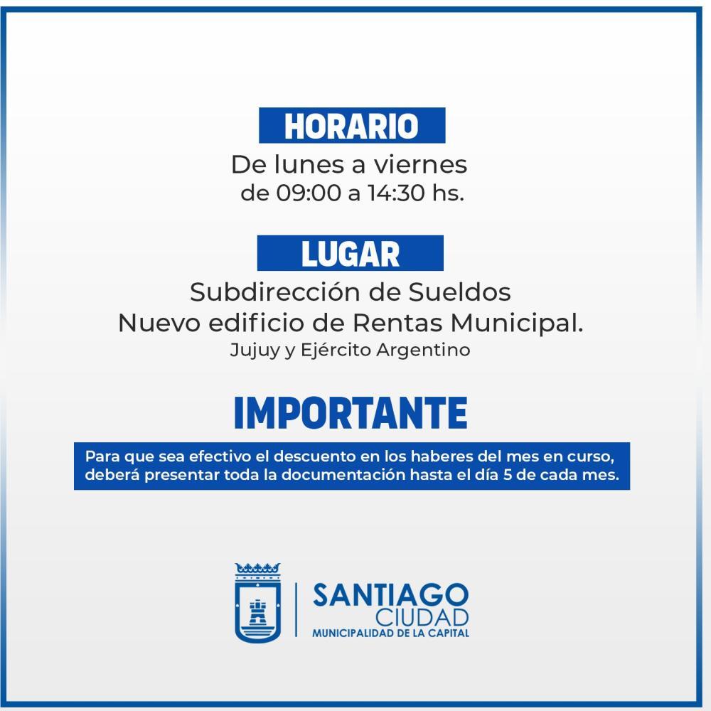 Por ese motivo, a través de la RESOL-2026-32-E-MUNISANTIAGO-SE, el área de Economía comunicó que los empleados que así lo requieran, deberán presentar de manera personal: una nota de solicitud, copia del DNI y recibo de haberes del interesado.