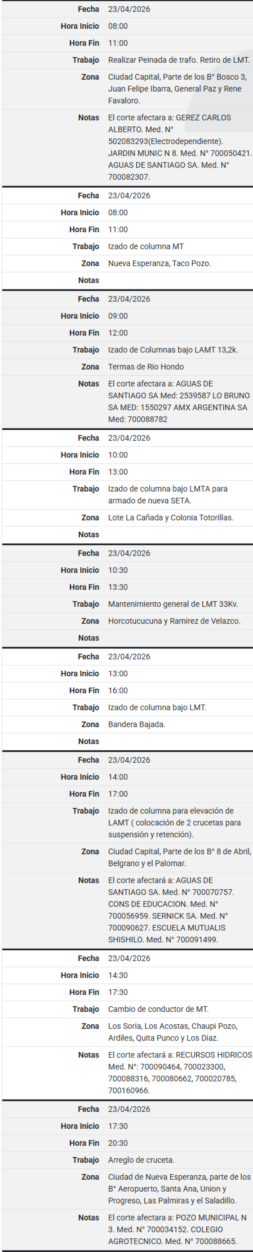 Este jueves 23 de abril se realizarán cortes programados de energía eléctrica en Santiago del Estero. La medida forma parte de tareas de mantenimiento y trabajos técnicos que la empresa distribuidora ejecutará para mejorar el servicio en distintos sectores de la provincia.