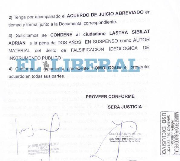 "Convenimos en una pena de dos años de prisión de cumplimiento en suspenso", detalla el documento firmado por los fiscales intervinientes.