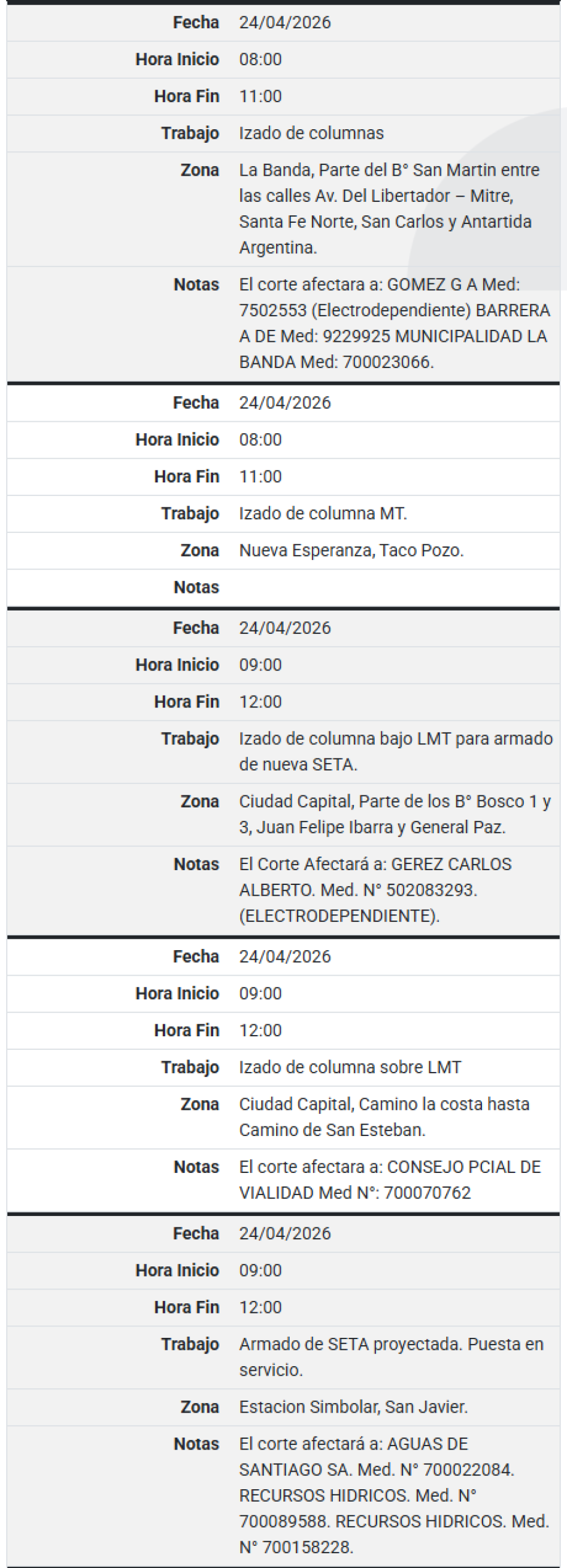 Este viernes 24 de abril se realizarán cortes programados de energía eléctrica en Santiago del Estero. La medida forma parte de tareas de mantenimiento y trabajos técnicos que la empresa distribuidora ejecutará para mejorar el servicio en distintos sectores de la provincia.