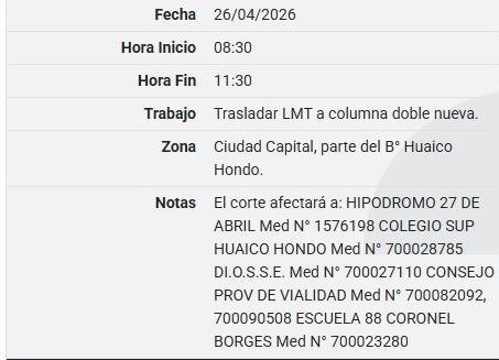 Cortes programados de electricidad para este 26 de abril en Santiago del Estero: a qué hora y en qué barrios Cortes programados de electricidad para este 26 de abril en Santiago del Estero: a qué hora y en qué barrios