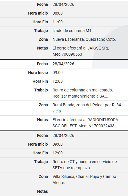 Cortes programados de electricidad para este 28 de abril en Santiago del Estero: a qué hora y en qué barrios Cortes programados de electricidad para este 28 de abril en Santiago del Estero: a qué hora y en qué barrios