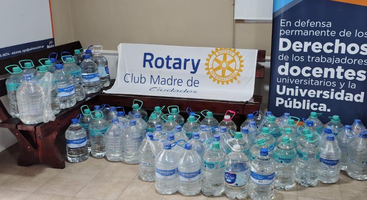 En el marco de una iniciativa solidaria conjunta, la ADUNSE y el Rotary Madre de Ciudades concretaron la entrega de agua potable destinada a familias afectadas por las inundaciones en la localidad de Los Telares, en el departamento Salavina.