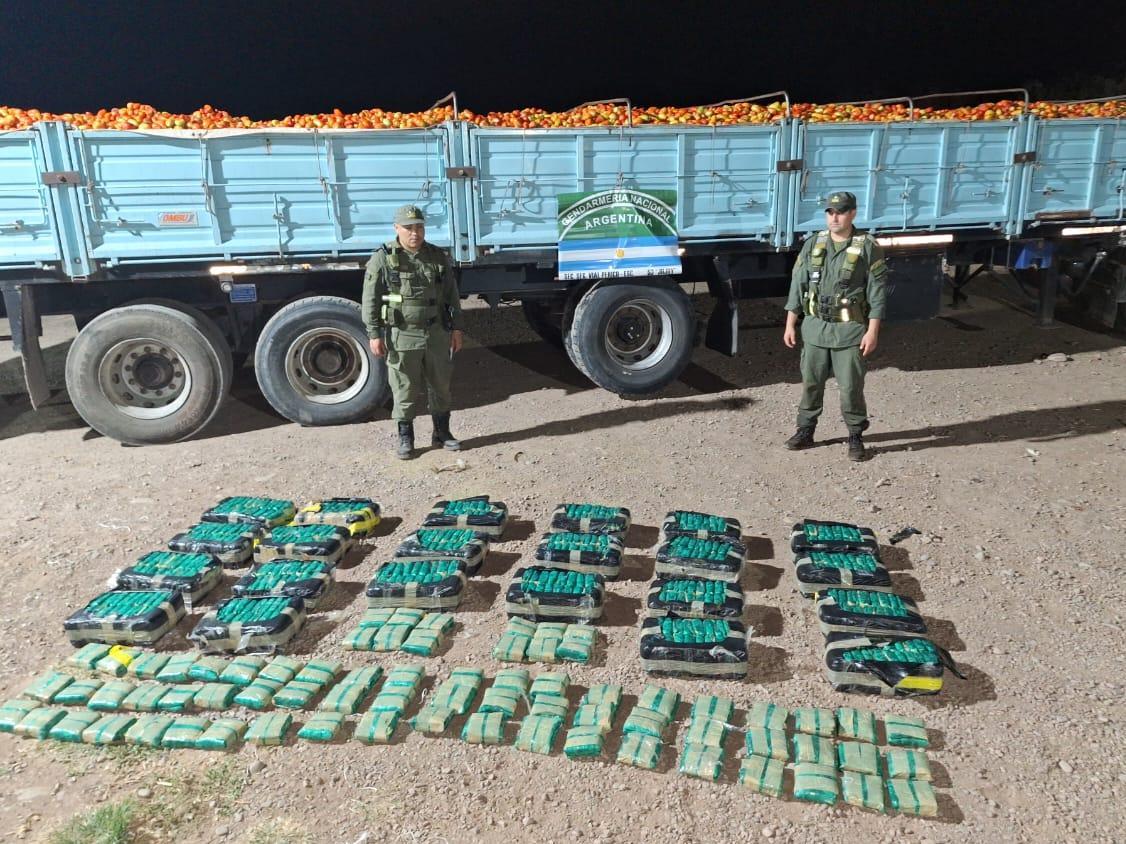 Otros 131 kilos 200 gramos de hojas de coca fueron incautados en la Ruta Nacional N° 34, a la altura del kilómetro 1.150, por efectivos de la Patrulla Fija "Pampa Blanca", dependiente del mismo Escuadrón, al inspeccionar un camión con semirremolque que trasladaba tomates a granel hacia Mendoza.