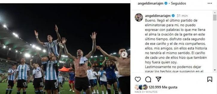 Gracias hinchada, gracias familia, gracias amigos y compañeros de selección, seguimos haciendo historia y eso quedará por toda la eternidad. ¡Vamos Argentina carajo!, sentenció Di María, héroe del conjunto nacional en las finales de la Copa América 2021, Finalissima 2022 y el Mundial de Qatar 2022.