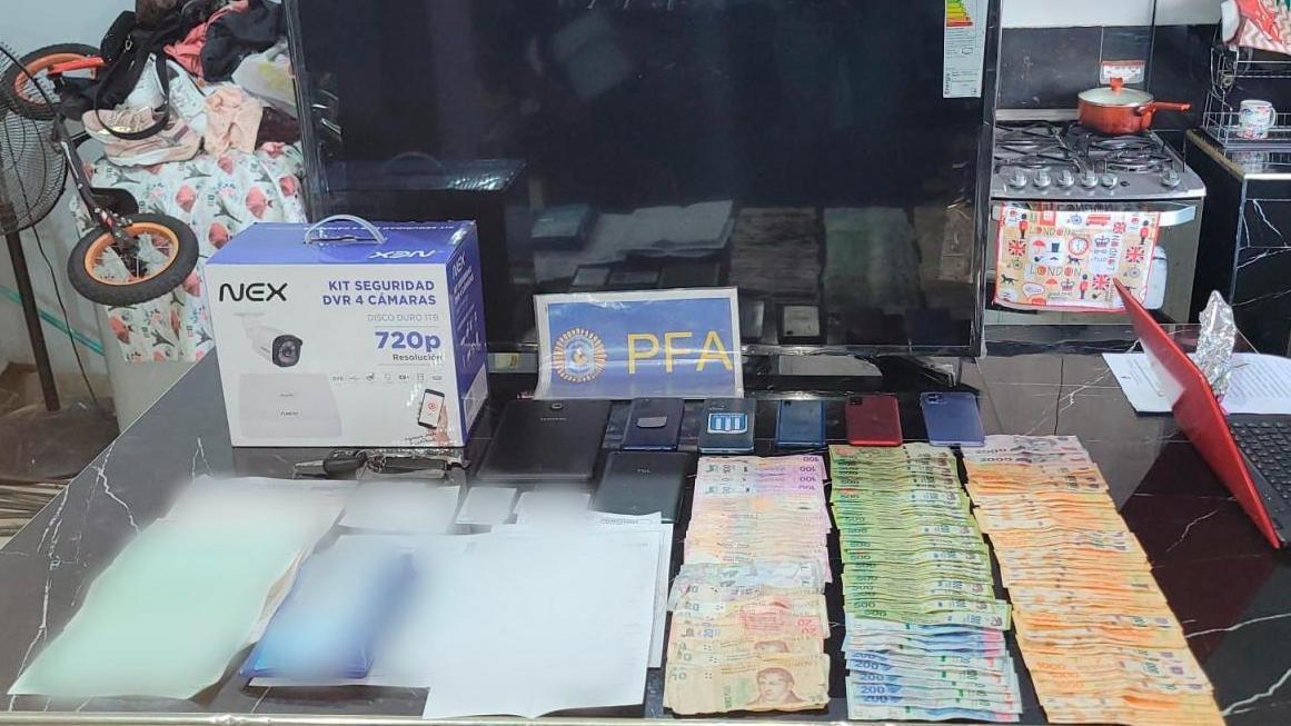 Durante el procedimiento se secuestraron gran cantidad de tarjetas de crédito y débito, 21 teléfonos celulares, varios artículos de electrónica, Tablet, PC de escritorio, un revólver calibre 22, 701 dólares, 7000 guaraníes, 673.430 pesos en efectivo y demás elementos de interés para la causa.