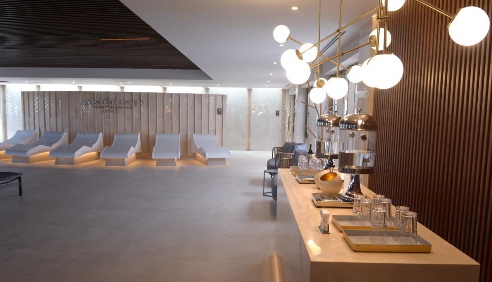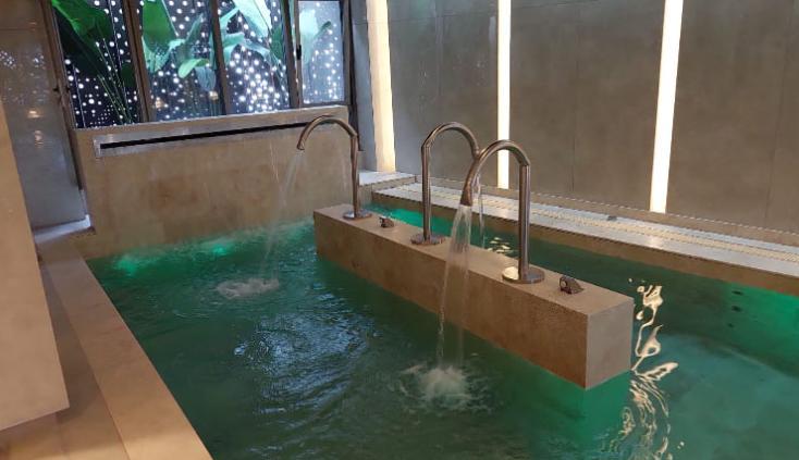 En cuanto a las terminaciones, resaltó: "Utilizamos porcelanatos anti deslizantes en piso porque son zonas de mucha presencia de agua. Después, mármoles travertinos por esa idea de caliza que veníamos de las viejas termas romanas. En cuanto a los colores, óxidos y demás, son colores del hotel, nosotros le agregamos más modernidad, así como los dorados que también los teníamos en presencia en el hotel, intentamos incorporarlos para que formen parte, pero con una idea un poco más moderna utilizando la iluminación y detalles constructivos que lo hagan un espacio distinto y agradable para los huéspedes".