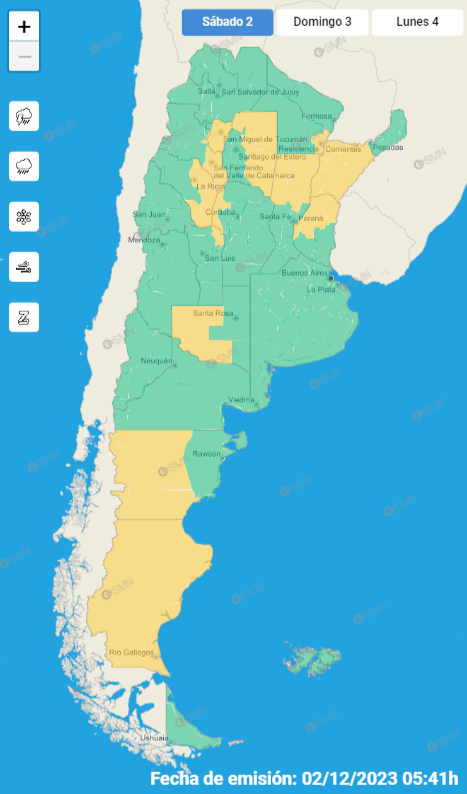 Consultado el sitio oficial del SMN, se informó que se encuentran bajo alerta las zonas de Figueroa - Oeste de Alberdi - Oeste de Copo - Oeste de Moreno - Pellegrini - Este de Alberdi - Este de Copo - Este de Moreno - Aguirre - Avellaneda - Belgrano - General Taboada - Juan F. Ibarra - Mitre - Quebrachos - Rivadavia - Salavina - Sarmiento.