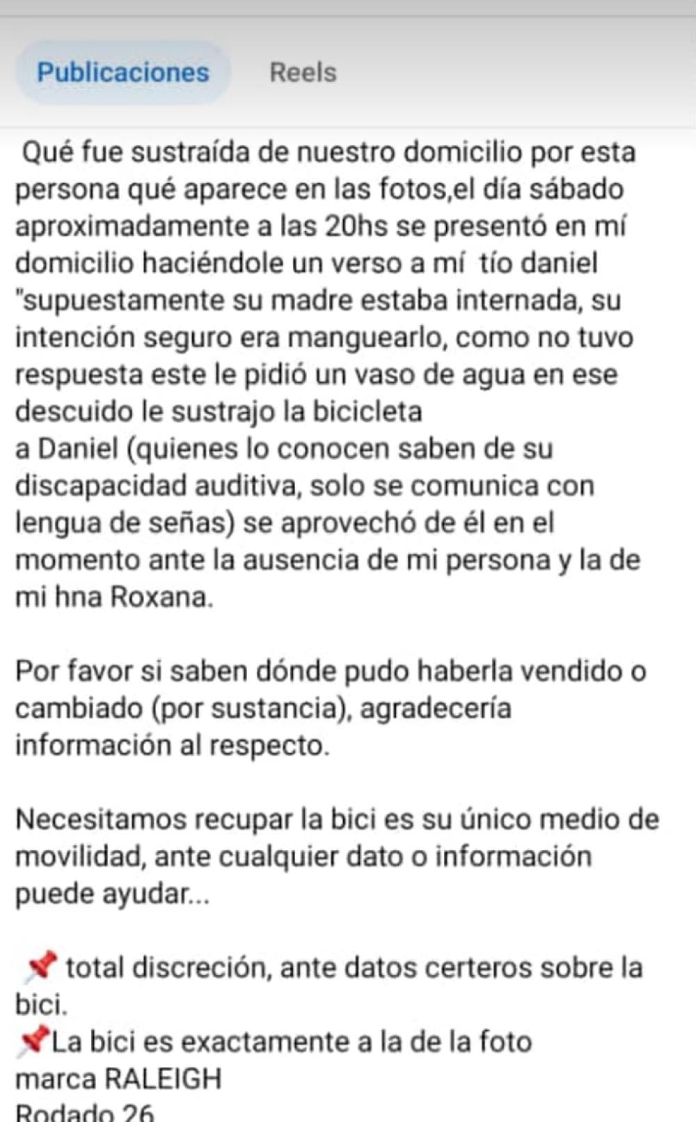 Horas después, la mujer realizó un posteo en redes sociales donde pidió la colaboración de vecinos para recuperar la bicicleta y brindó algunos detalles del ilícito; entre ellos, que la víctima fue su tío quien padece una discapacidad auditiva.