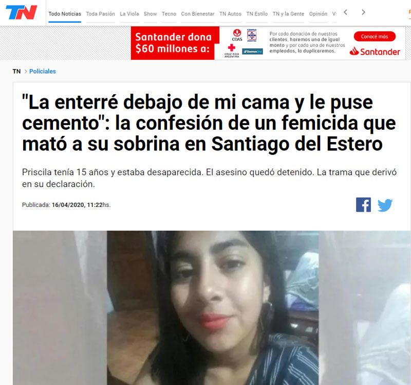 Profunda consternación se vive en la provincia de Santiago del Estero luego de que se descubriera el horrendo femicidio de la adolescente Priscila Alejandra Martínez (15).